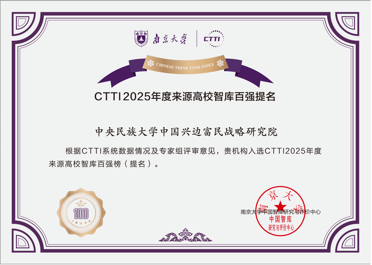 近日,由南京大学主办、南京大学中国智库研究与评价中心承办的“2025新型智库治理论坛”在南京举办,论坛公布了CTTI2025年度来源高校智库百强榜。中央民族大学中国兴边富民战略研究院入选CTTI2025年度来源高校智库百强榜(提名)。